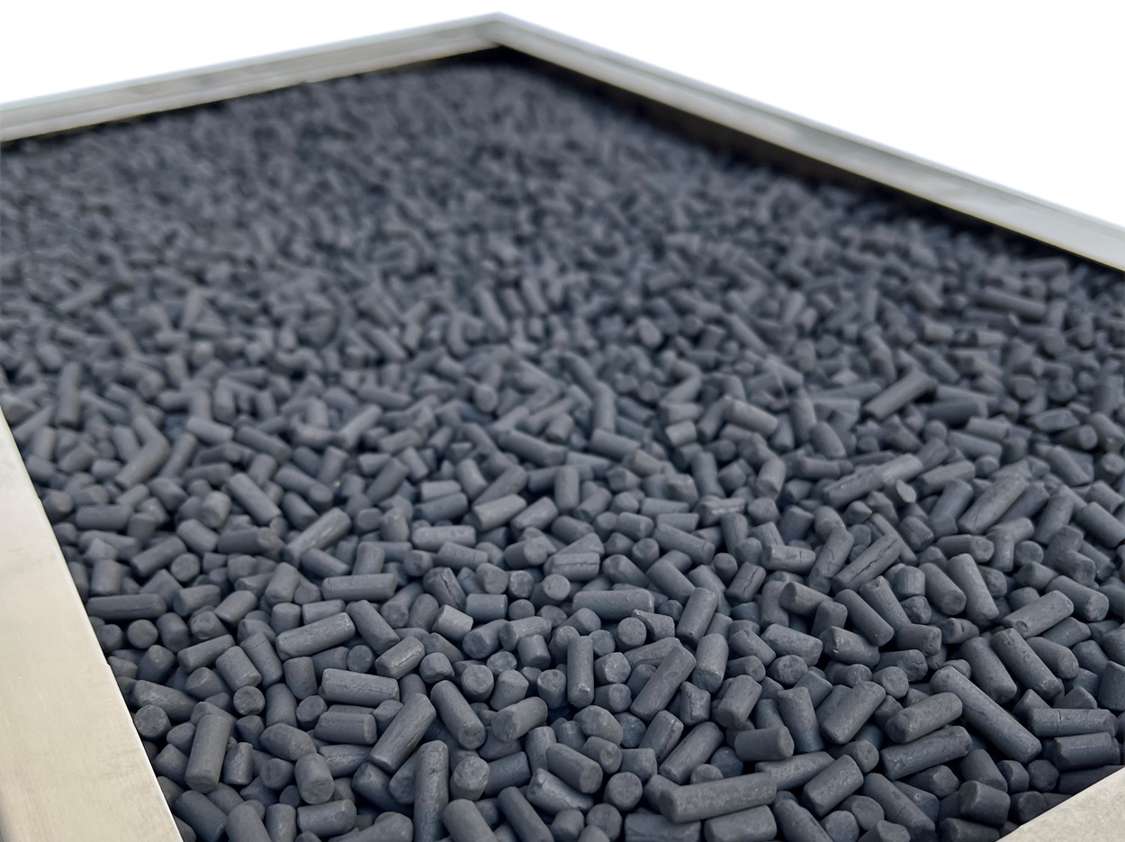 – Grains of physically activated pinewood carbon.